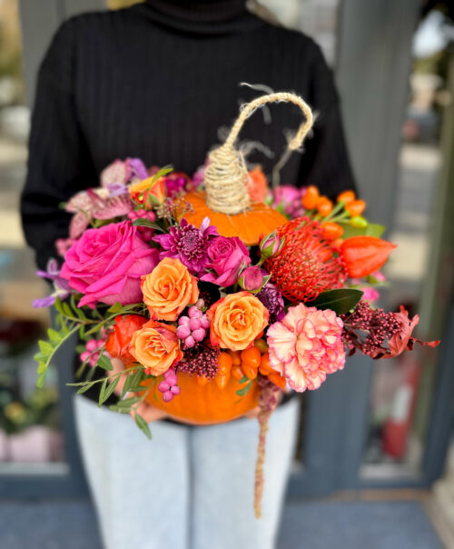 Acest aranjament conține: dovleac, mix flori si plante de toamna in nuante de fuchsia si portocliu (trancafiai, miniroze, skimmia, garoafe, nutans, pistaccia) alte materiale.
