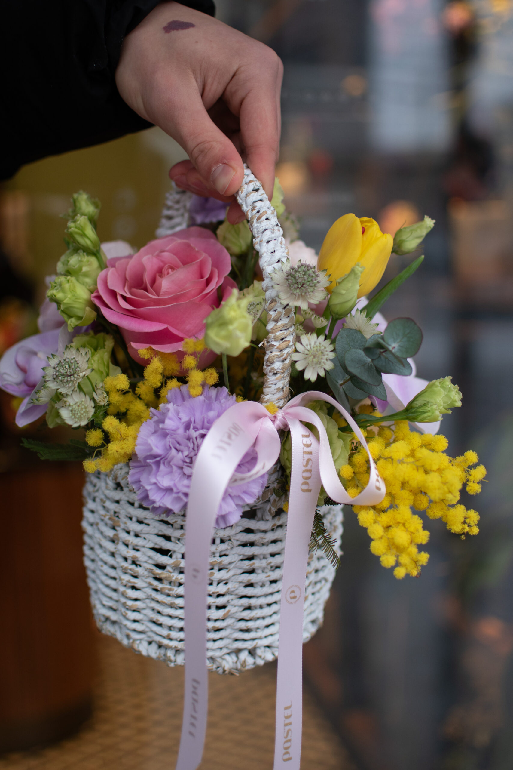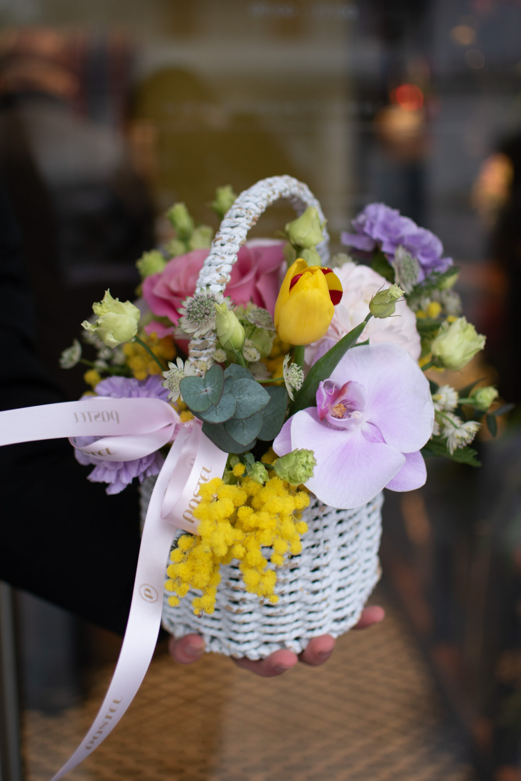 Acest aranjament conține: cos împletit 12×15 cm, 2 trandafiri, 2 cupe phalaenopsis, 1 lalea, 2 lisianthus, 2 garoafe, 2 astrantia, mimosa, 2 eucalipt, funda pastel, alte materiale.