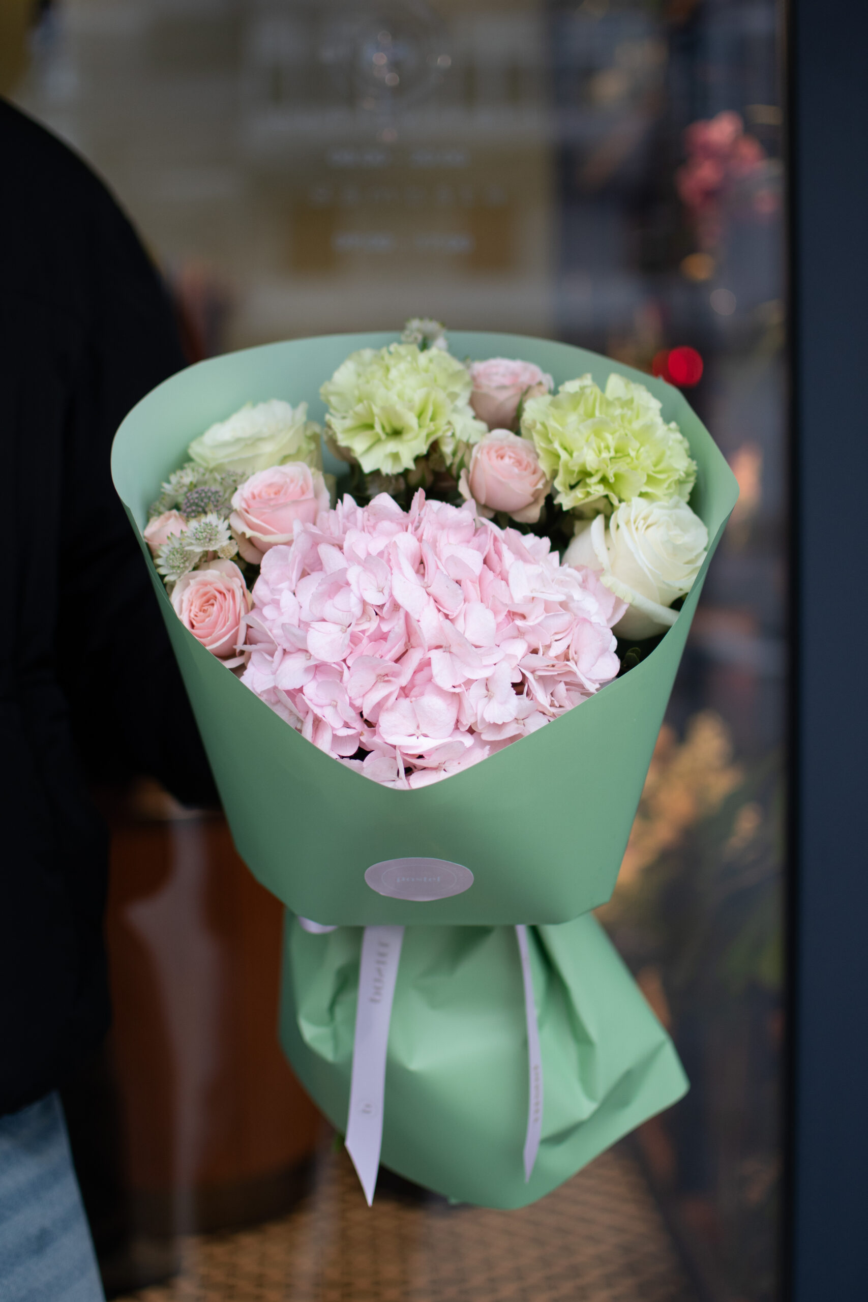 Acest produs contine: 1 hortensie, 2 minirose, 2 trandafiri, 2 garoafe, 2 astrantia, 2 coli, funda pastel, alte materiale.
